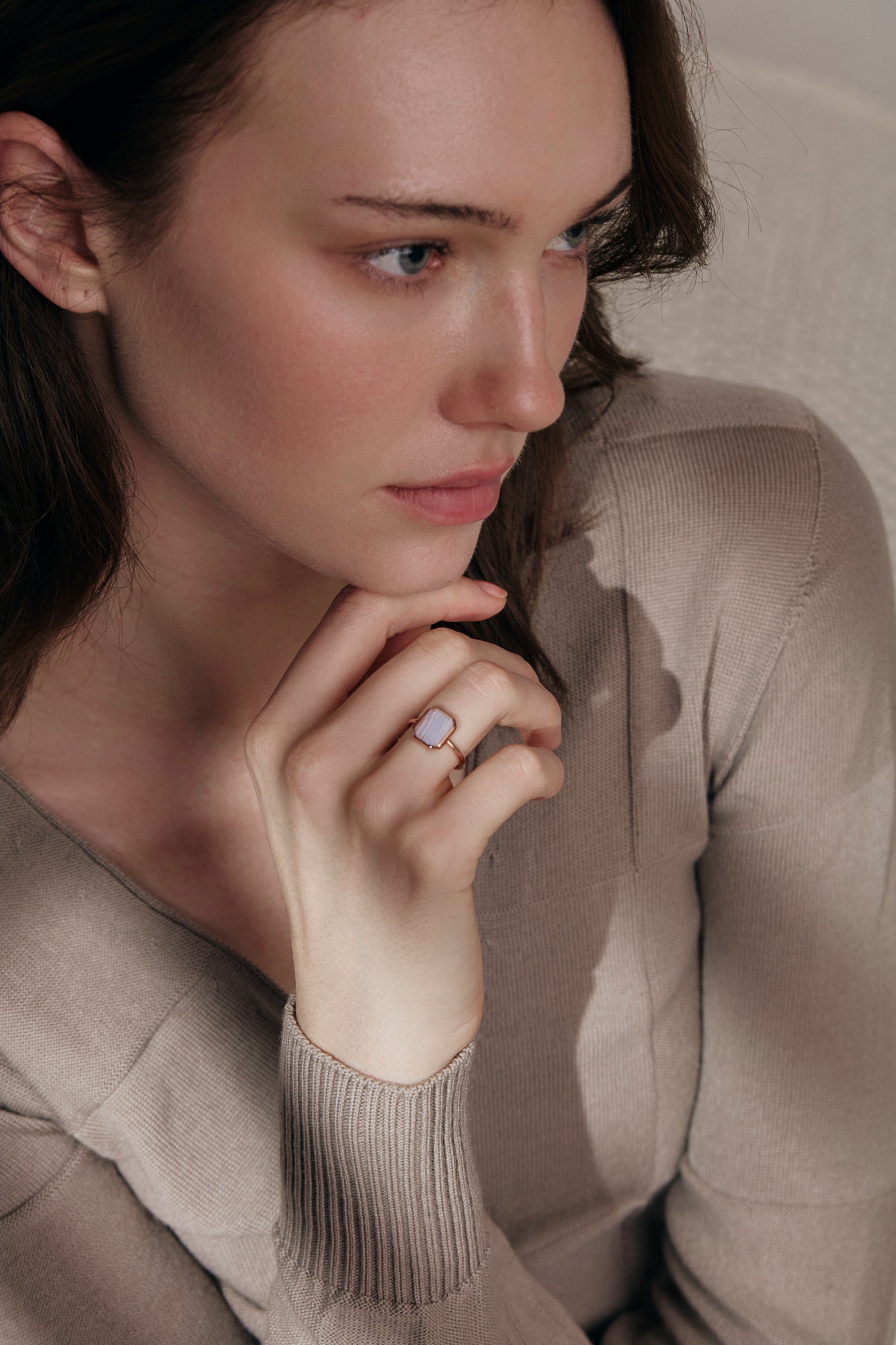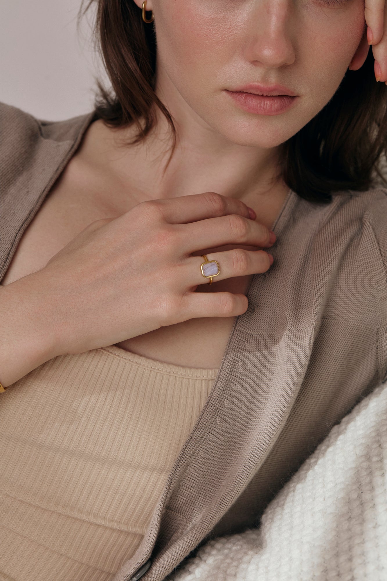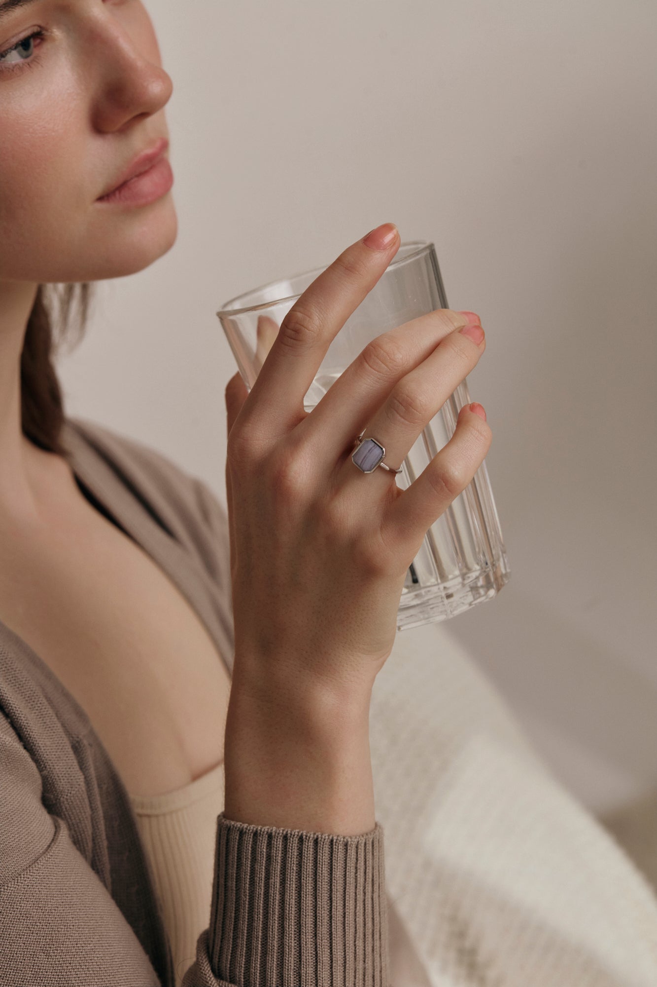 Blue Lace Agate is an incredibly soothing and nurturing stone. With its delicate pale blue and white banding patterns, it exudes soothing and calming energies. She looks great on any skin tone, making it an excellent ring for the everyday.
