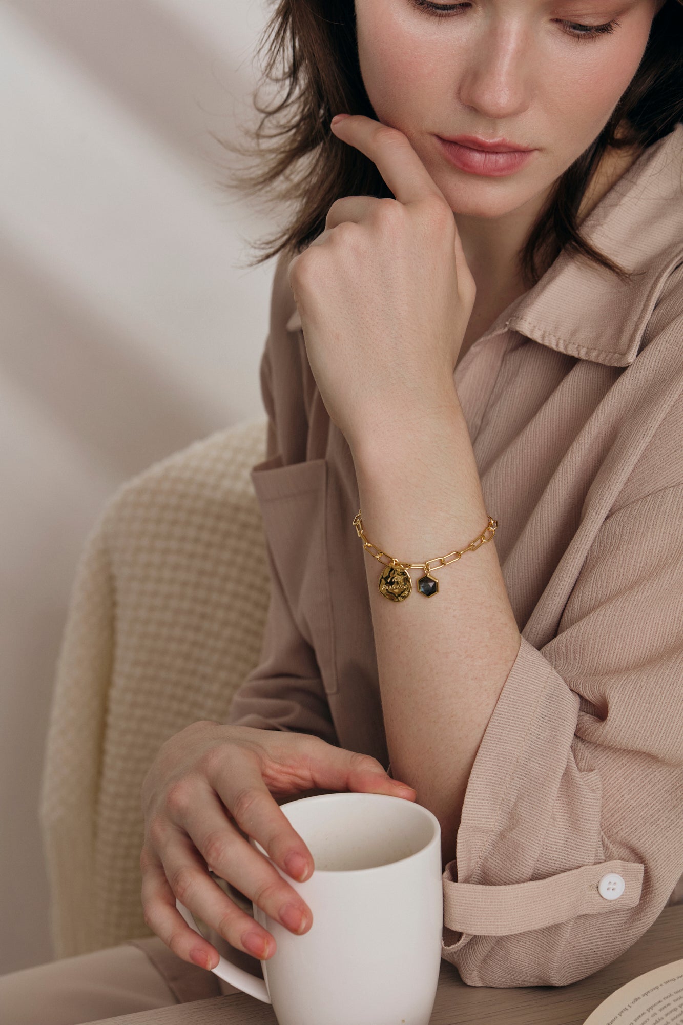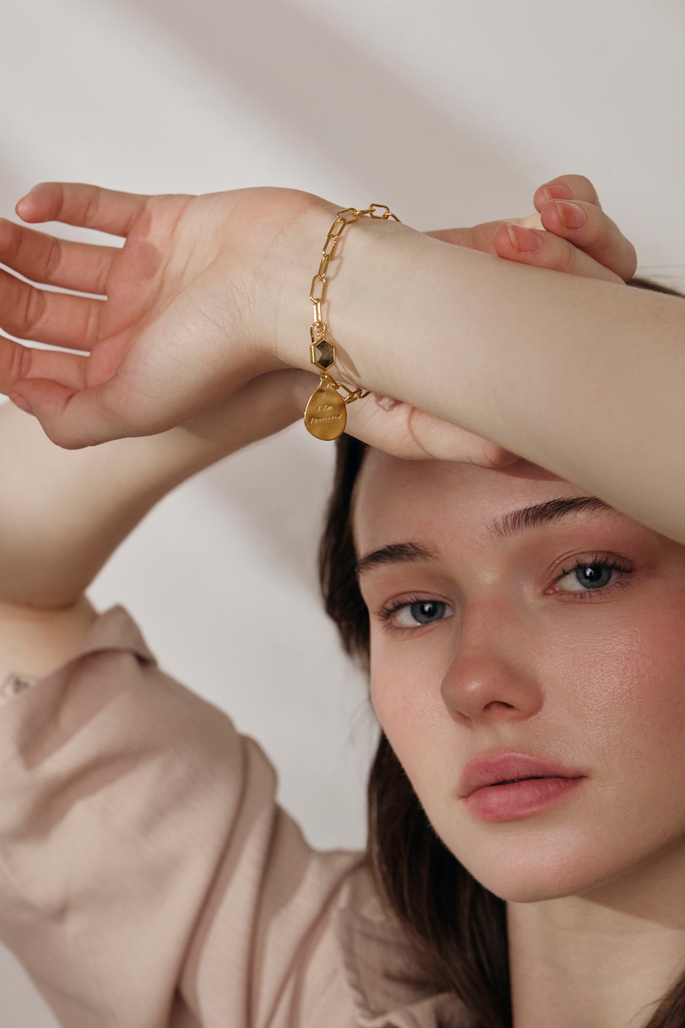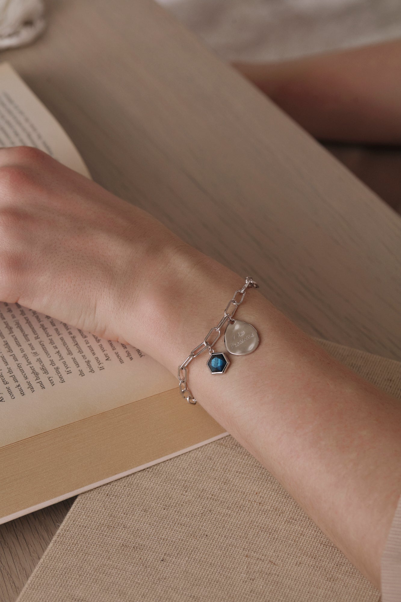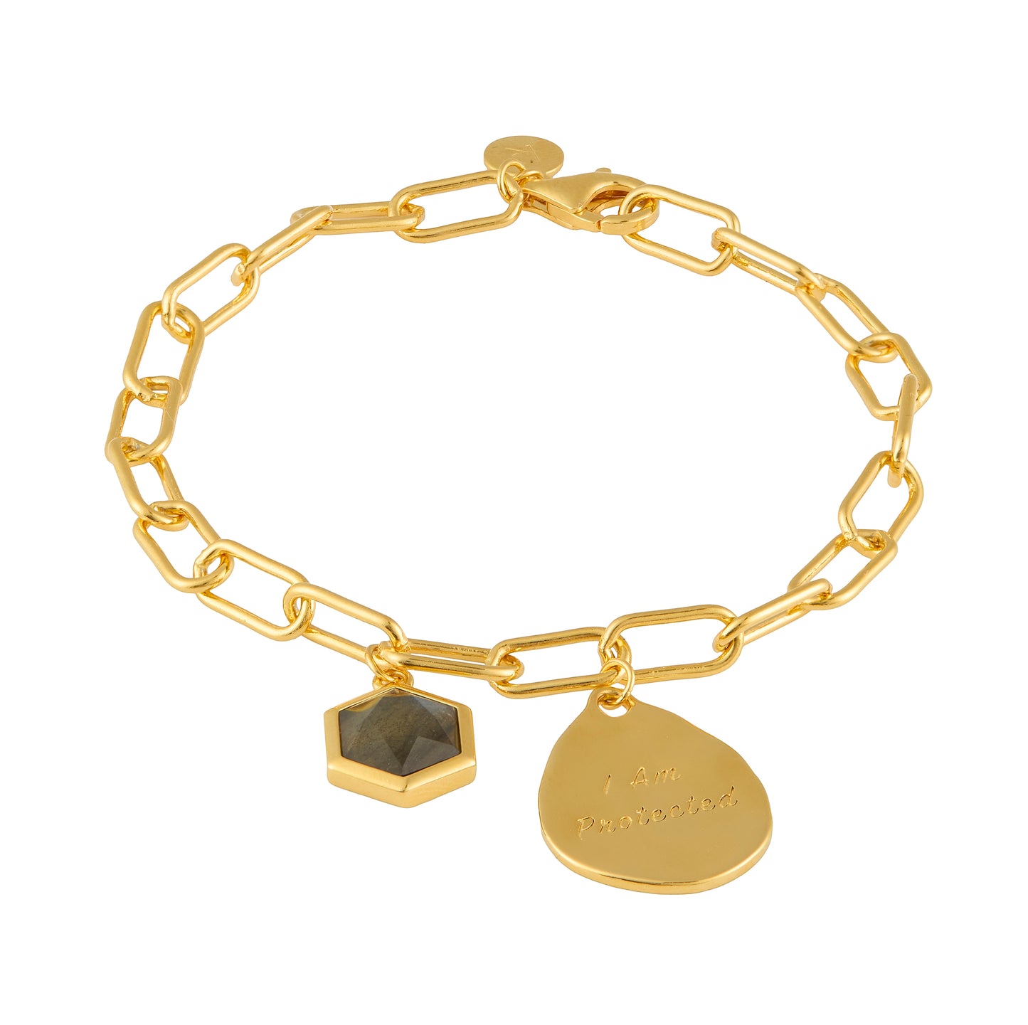 In this series of affirmation bracelets, the 'I Am Protected' Affirmation Charm Bracelet is designed to relief stress and anxiety. Paired with a stunning Labradorite crystal, known as a bringer of light, helping to dispel fear and insecurity and promoting self-confidence.