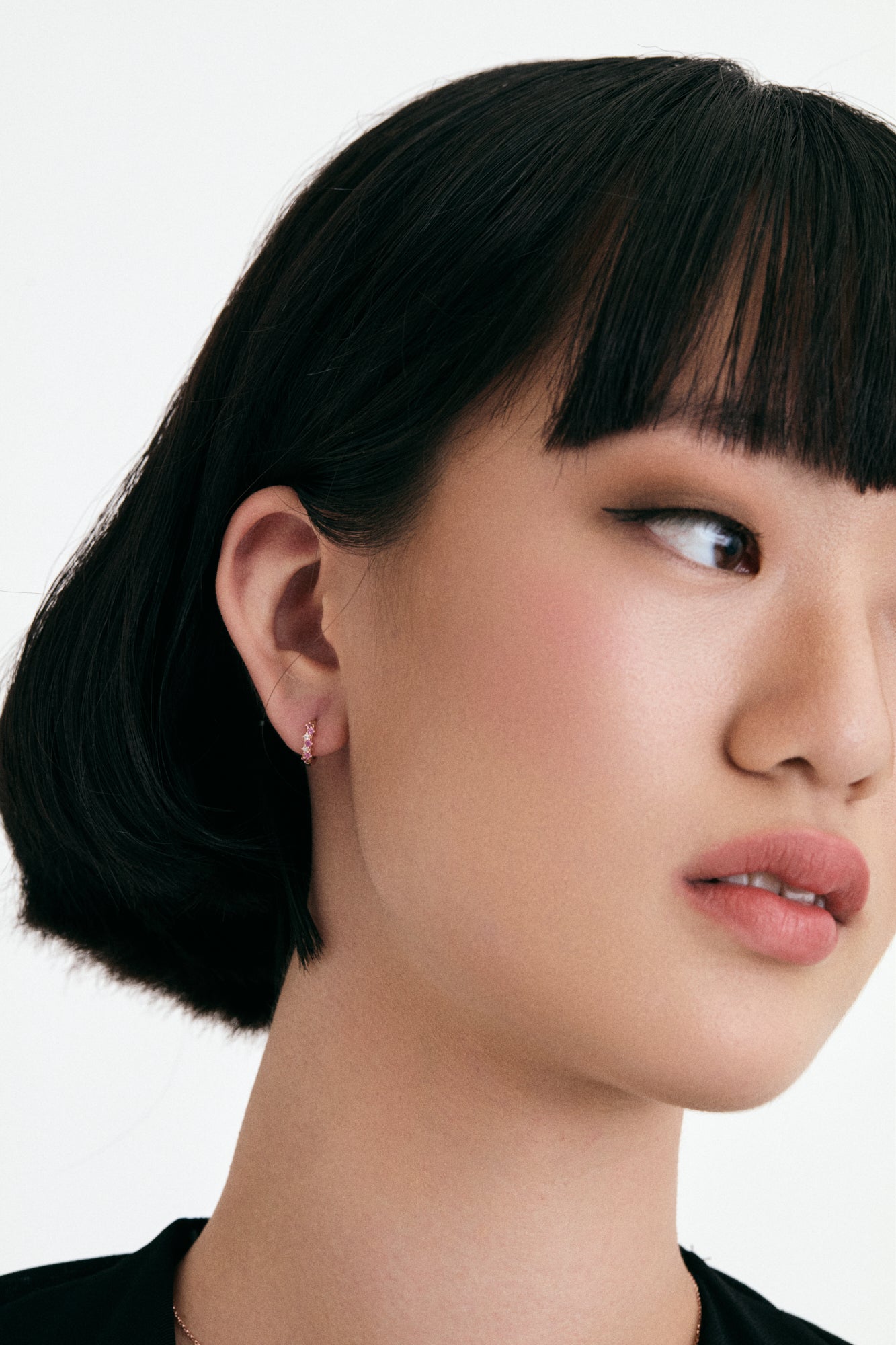 Made from solid 14K Rose Gold, she is the perfect everyday companion that you'll never have to take off! Inspired by the milky way and stars, this pair of dainty huggie earrings is made up of a cluster of pink sapphires and conflict-free lab-grown diamonds.