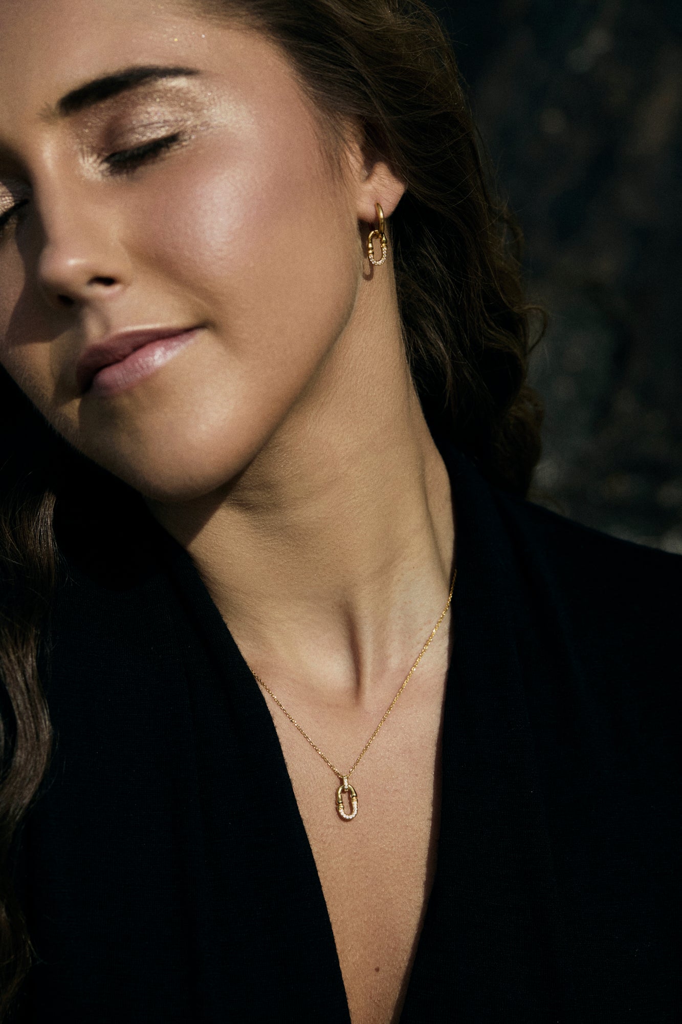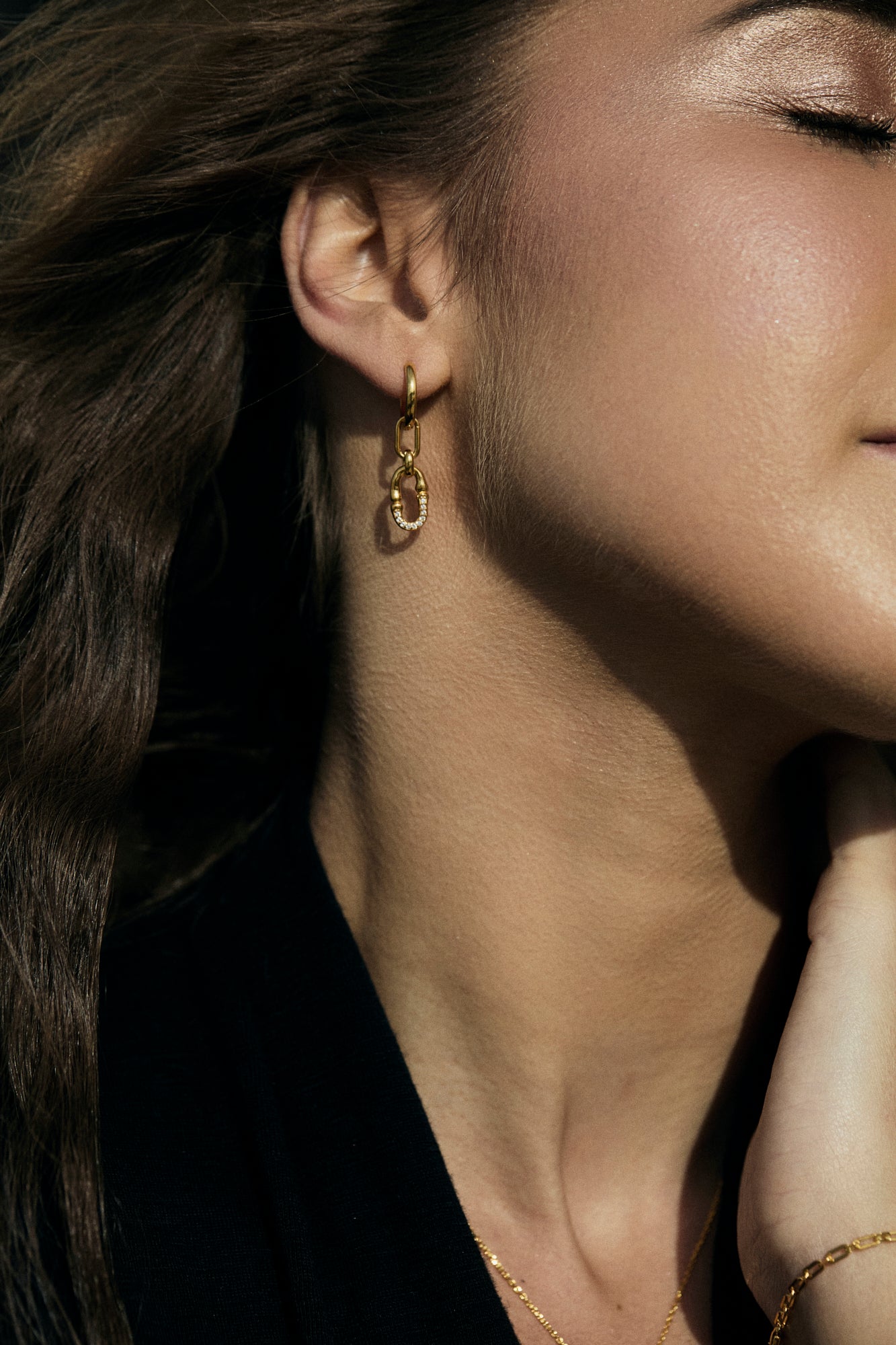 The Strength White Topaz Chain Huggie Earrings is a stylish number! With its asymmetrical design, she draws attention by breaking monotony. Elegant and graceful, she sways with each movement she makes.