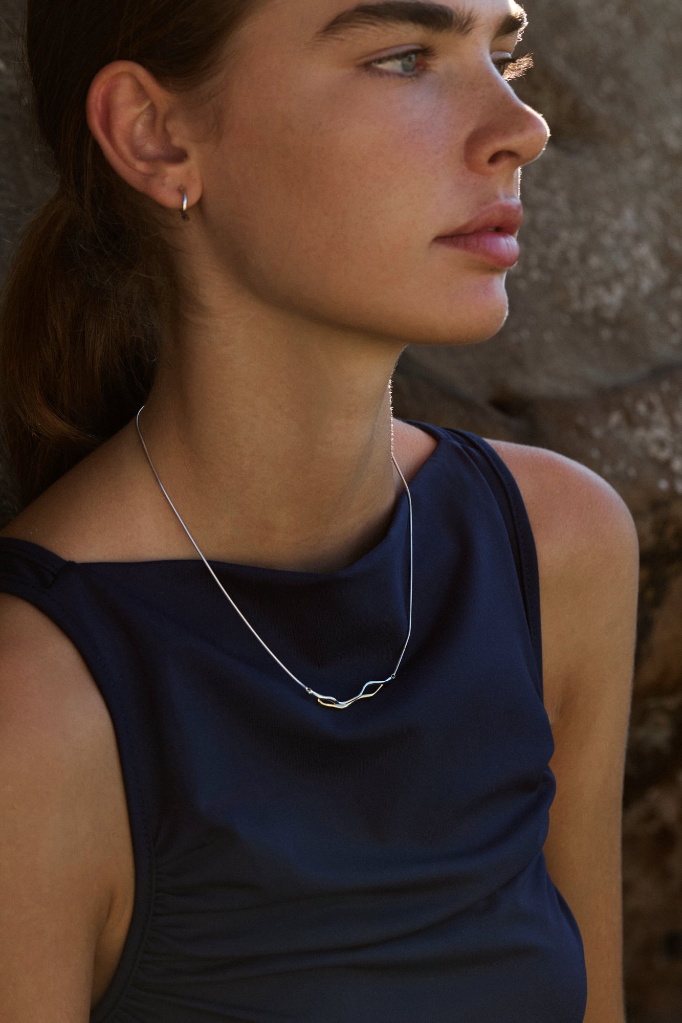 Elegant free flowing lines take center stage in the Flow Mixed Metal Sculptural Necklace. Rhythmic lines that mimic a flowing river, beautiful gentle movements that soothes and calms. The necklace features a two-tone sculptural pendant on a sleek snake chain, with an adjustable sliding bead that allows you to adjust the length of the chain to your desired length up to 18 inches.