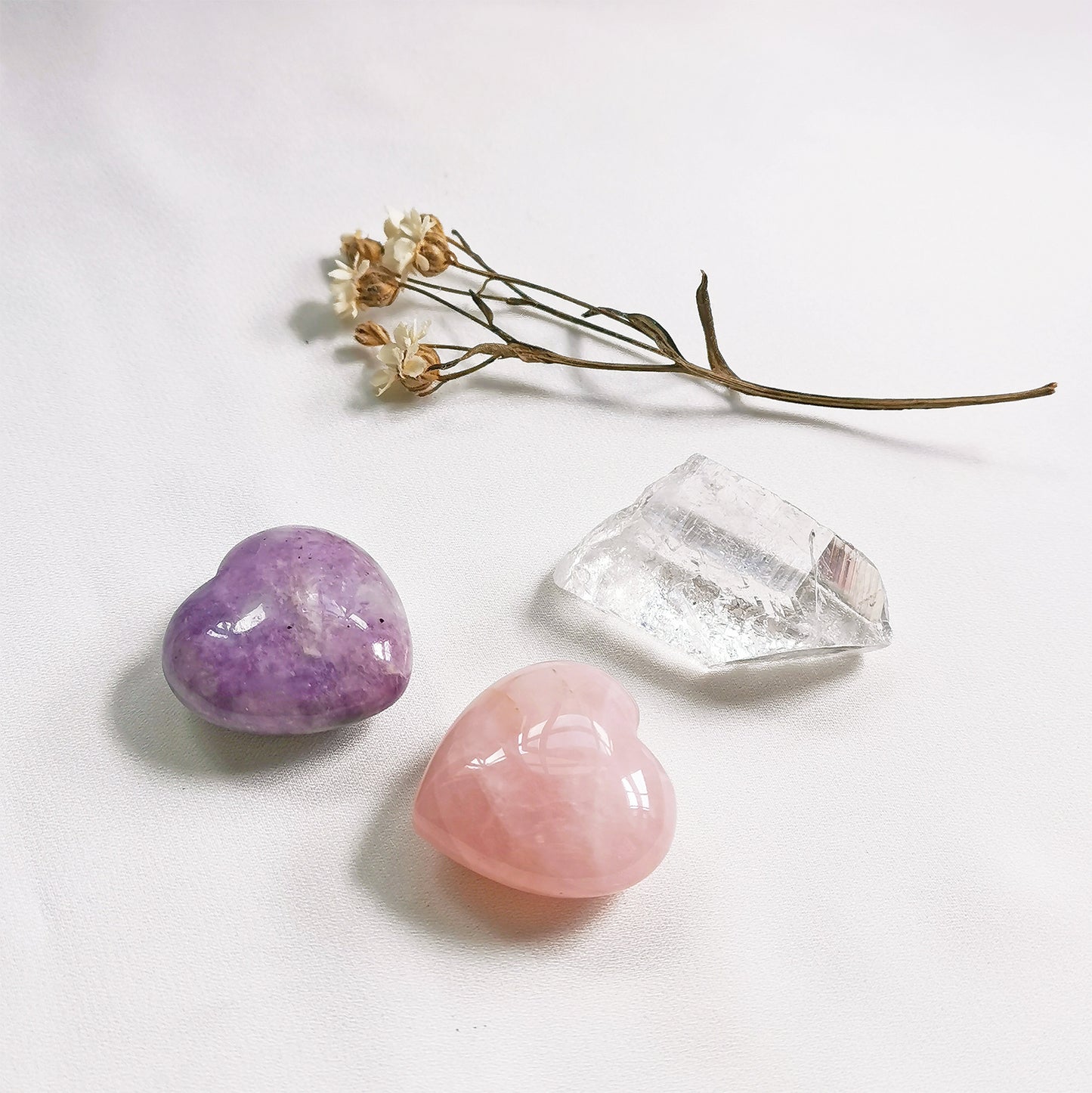 This healing crystal kit is a special one. An extension from our Self-Love Crystal Kit series, we introduce the Heart Chakra Crystal Kit. Sweet pocket size heart shaped Rose Quartz & Lepidolite and a Clear Quartz Crystal to aid you on balancing and healing your heart chakra.