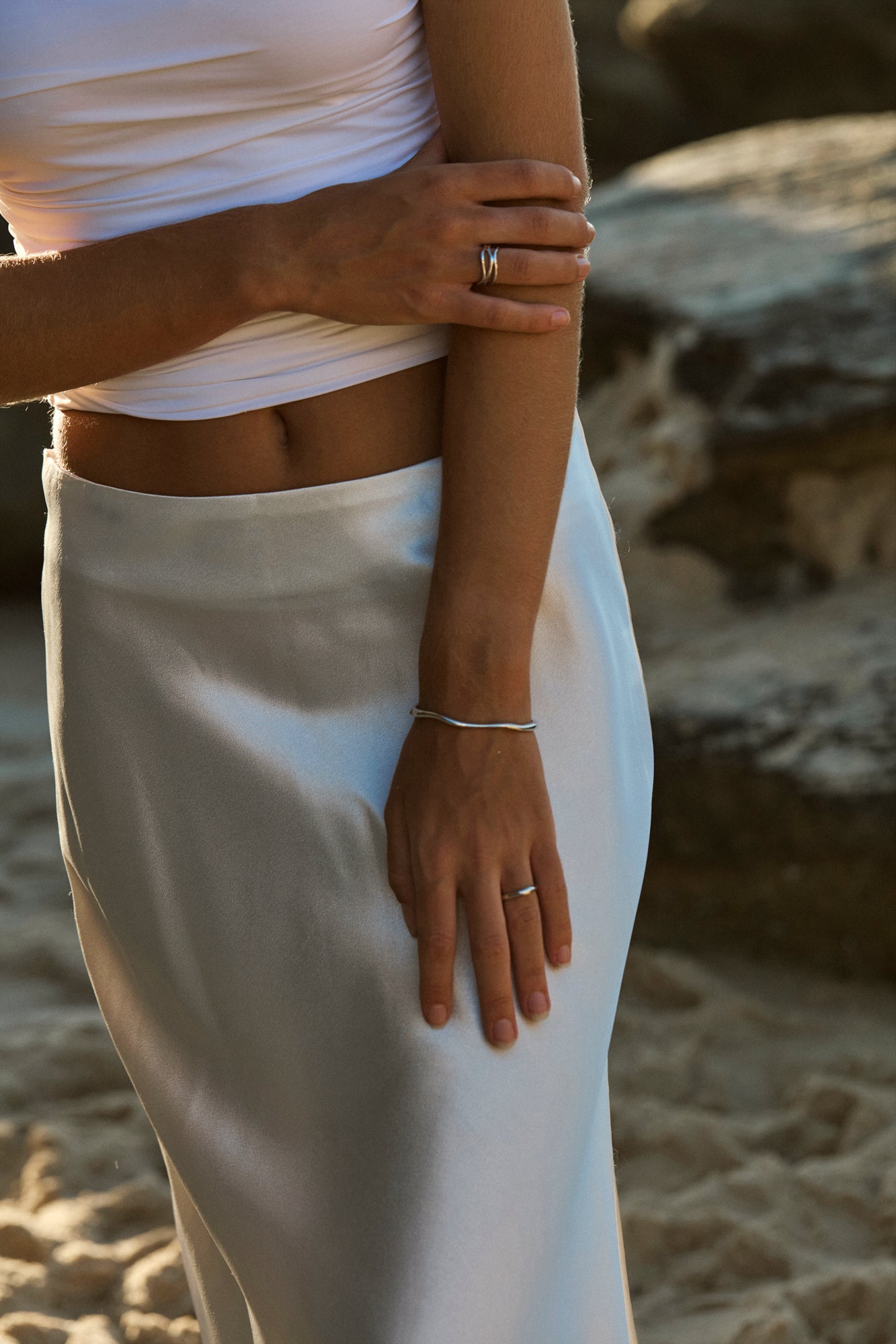 Person wearing silver jewellery with a white top and beige skirt on a sandy background