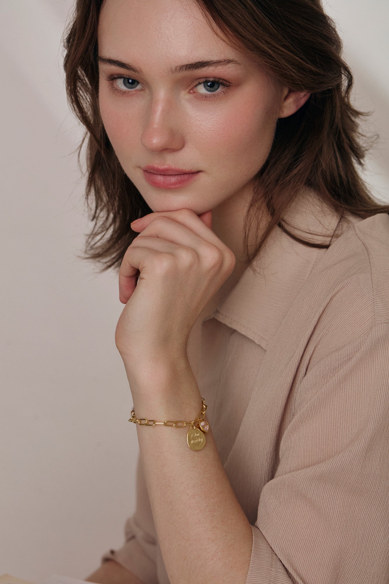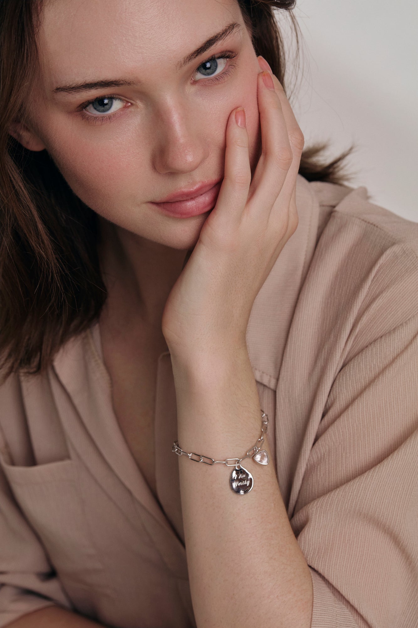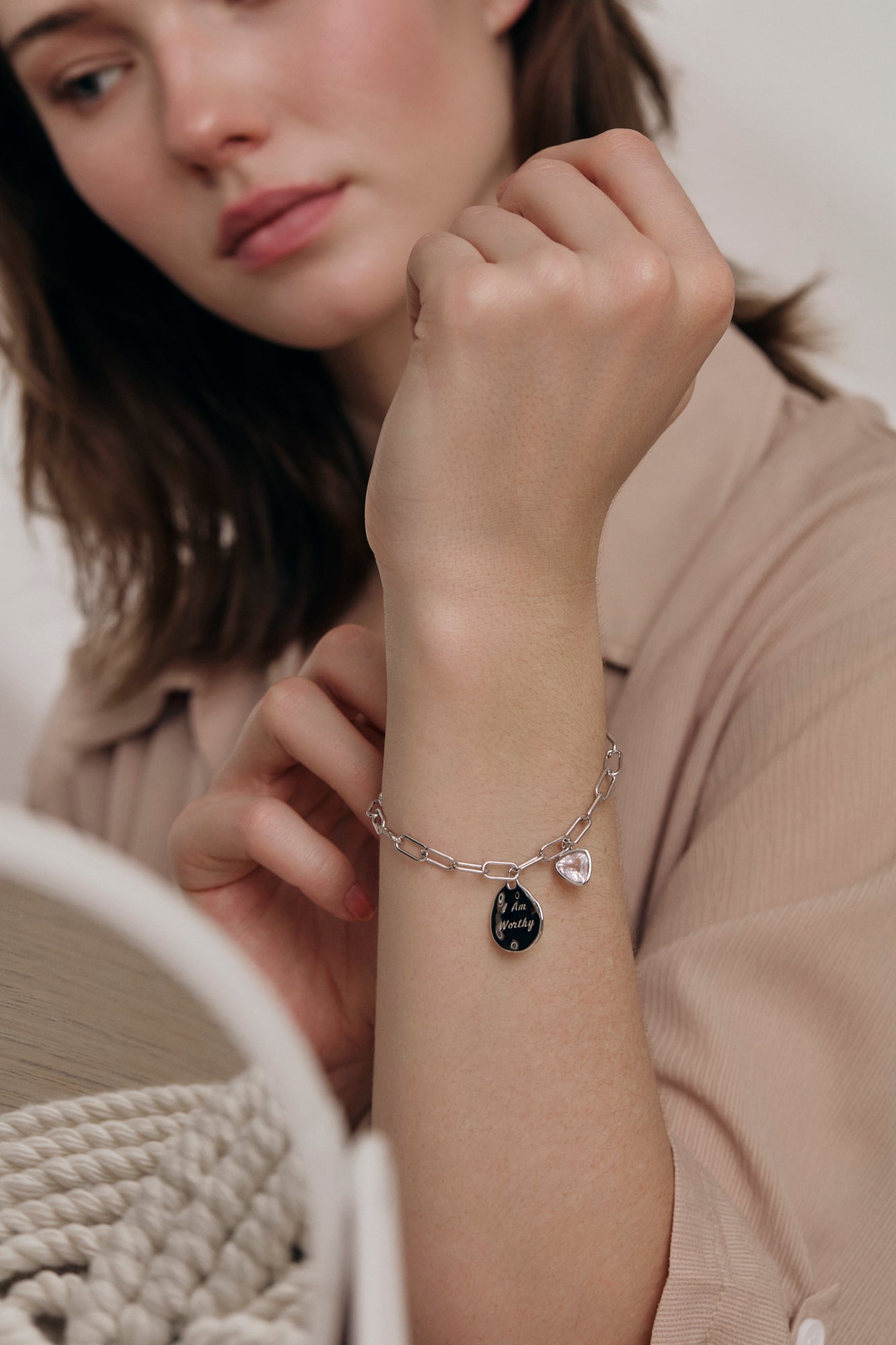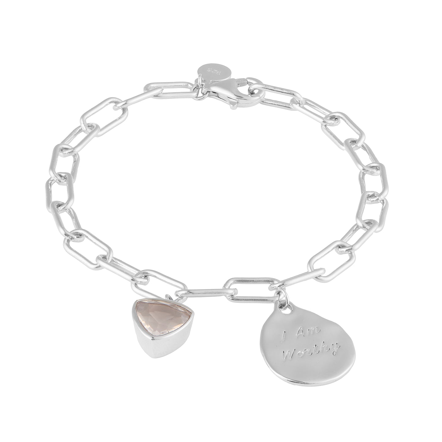 In this series of affirmation bracelets, the 'I Am Worthy' Affirmation Charm Bracelet is designed to boost self-worth and self-love. The bracelet is paired with a beautiful trillion cut Rose Quartz. Rose Quartz will encourage self-forgiveness and acceptance, invoking self-trust and self-worth.