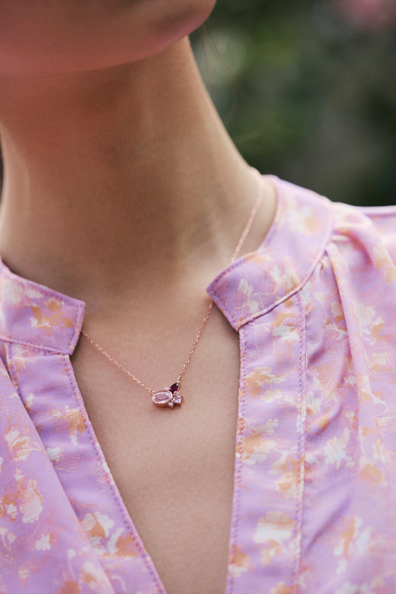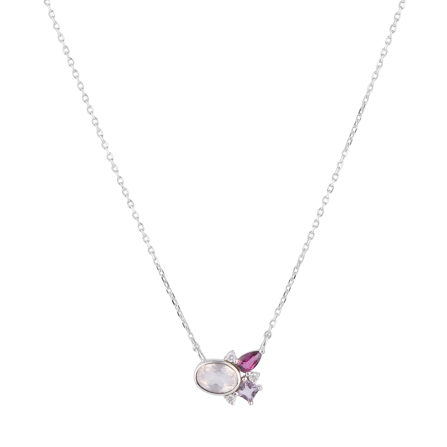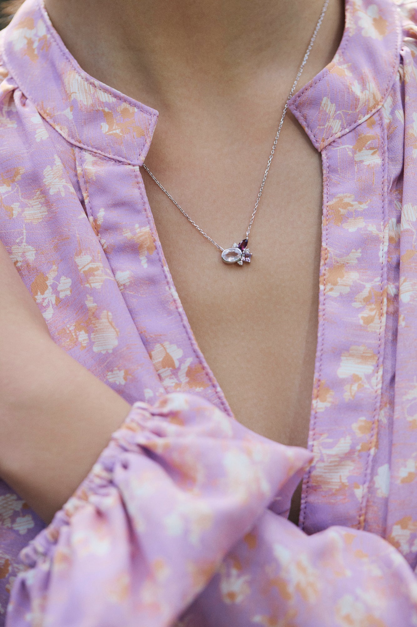 • Stone: Rose Quartz (oval), Rhodolite (pear), Amethyst (square), White Zircon (round)