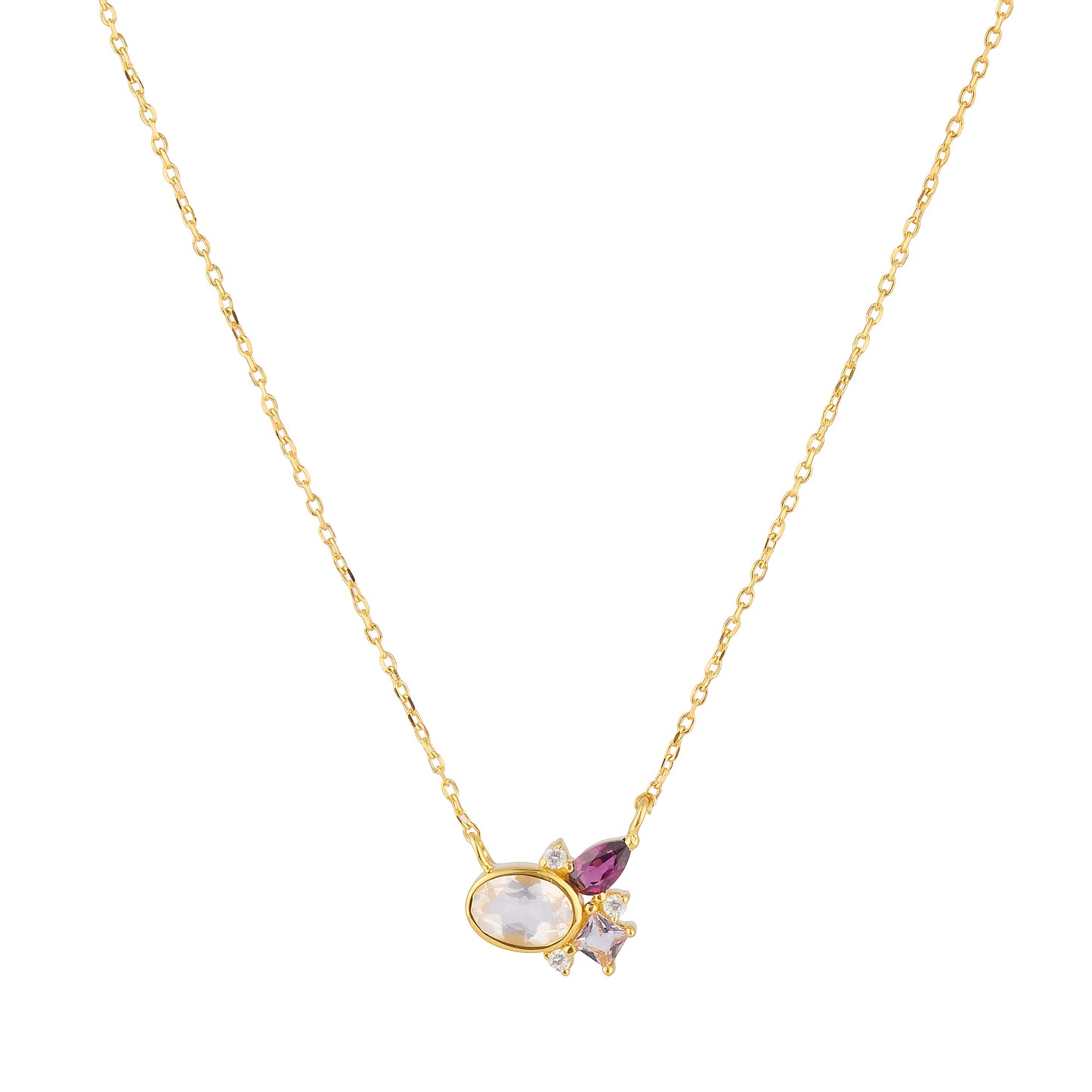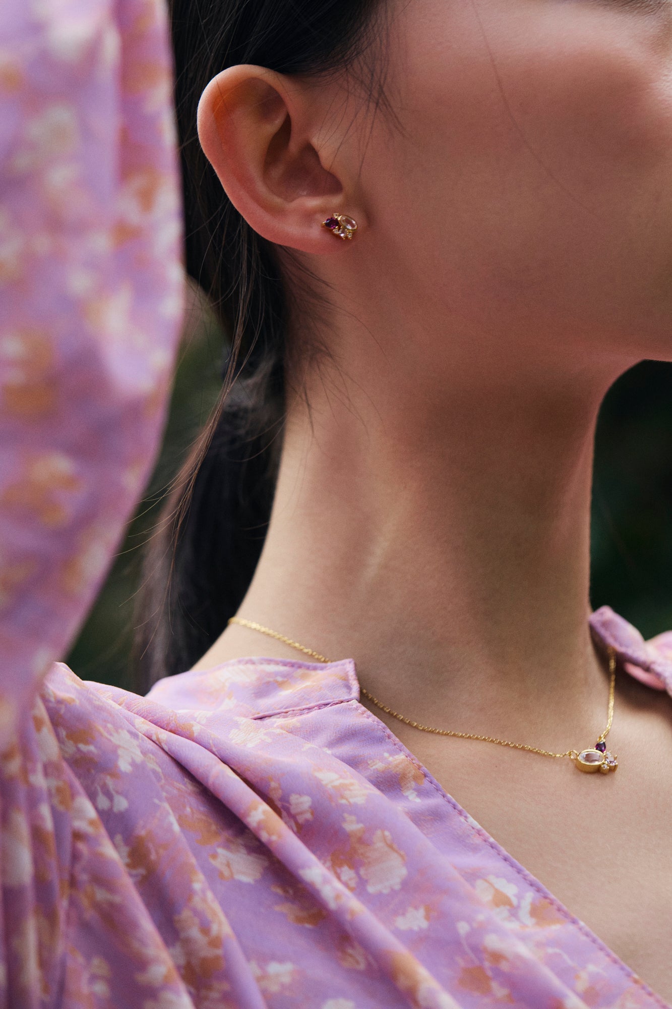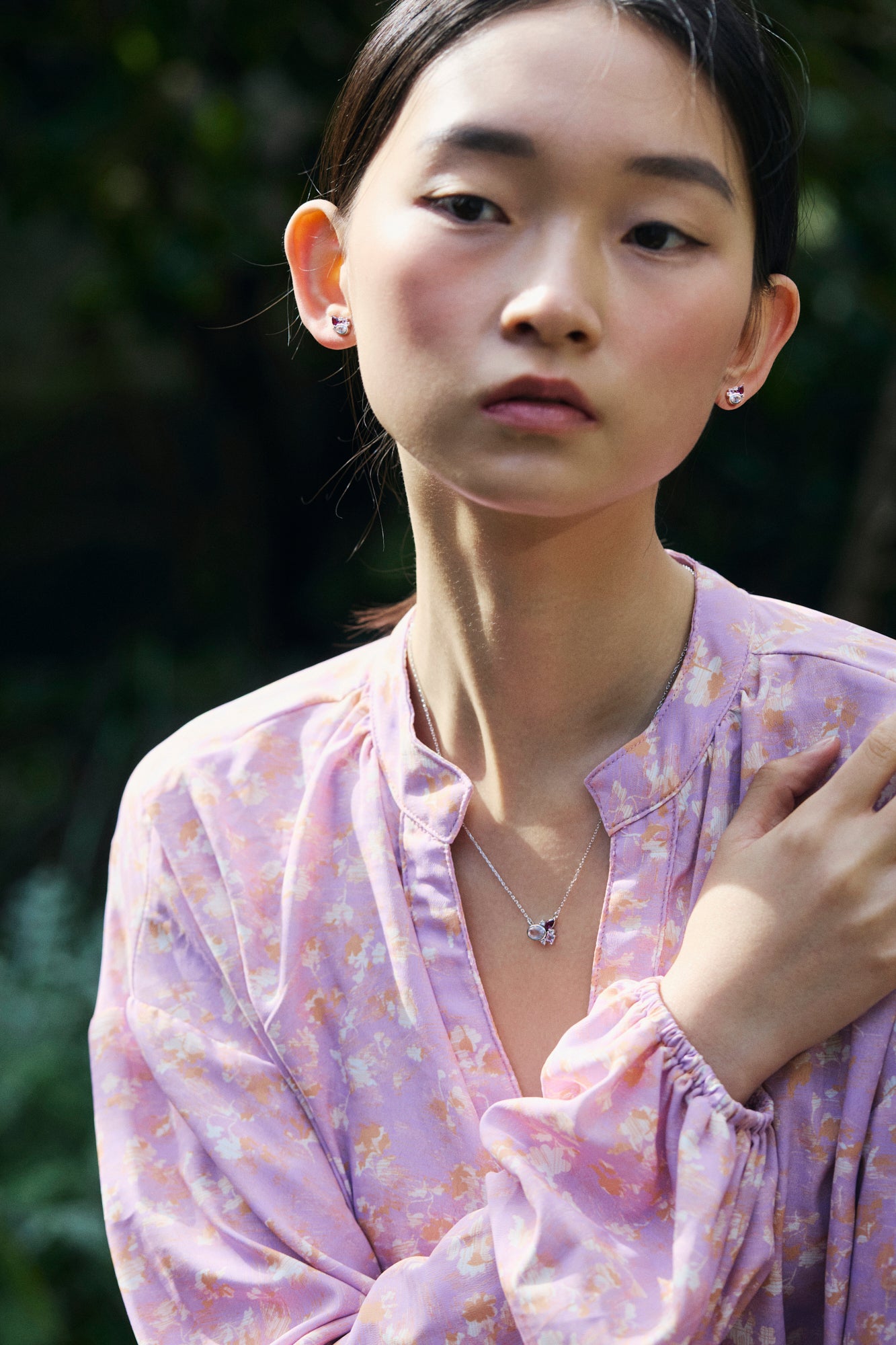 • Stone: Rose Quartz (oval), Rhodolite (pear), Amethyst (square), White Zircon (round)